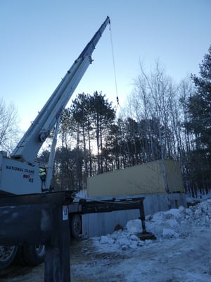 Kuehn's Crane Service was onsite to lift the containers off of the chassis. They swung them into place and then working together, the team set the containers down precisely on the foundation.